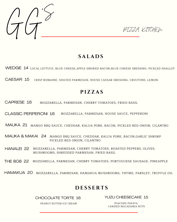 Savor fresh, handcrafted flavors with a local twist. From crisp salads and artisan pizzas made with the finest ingredients to decadent desserts with island-inspired touches, every bite is designed to delight. Whether you’re craving a classic favorite or something uniquely Hawaiian, GG’s Pizza Kitchen is the perfect spot to enjoy bold flavors in a casual, inviting atmosphere. Open Nightly from 6pm - 10pm